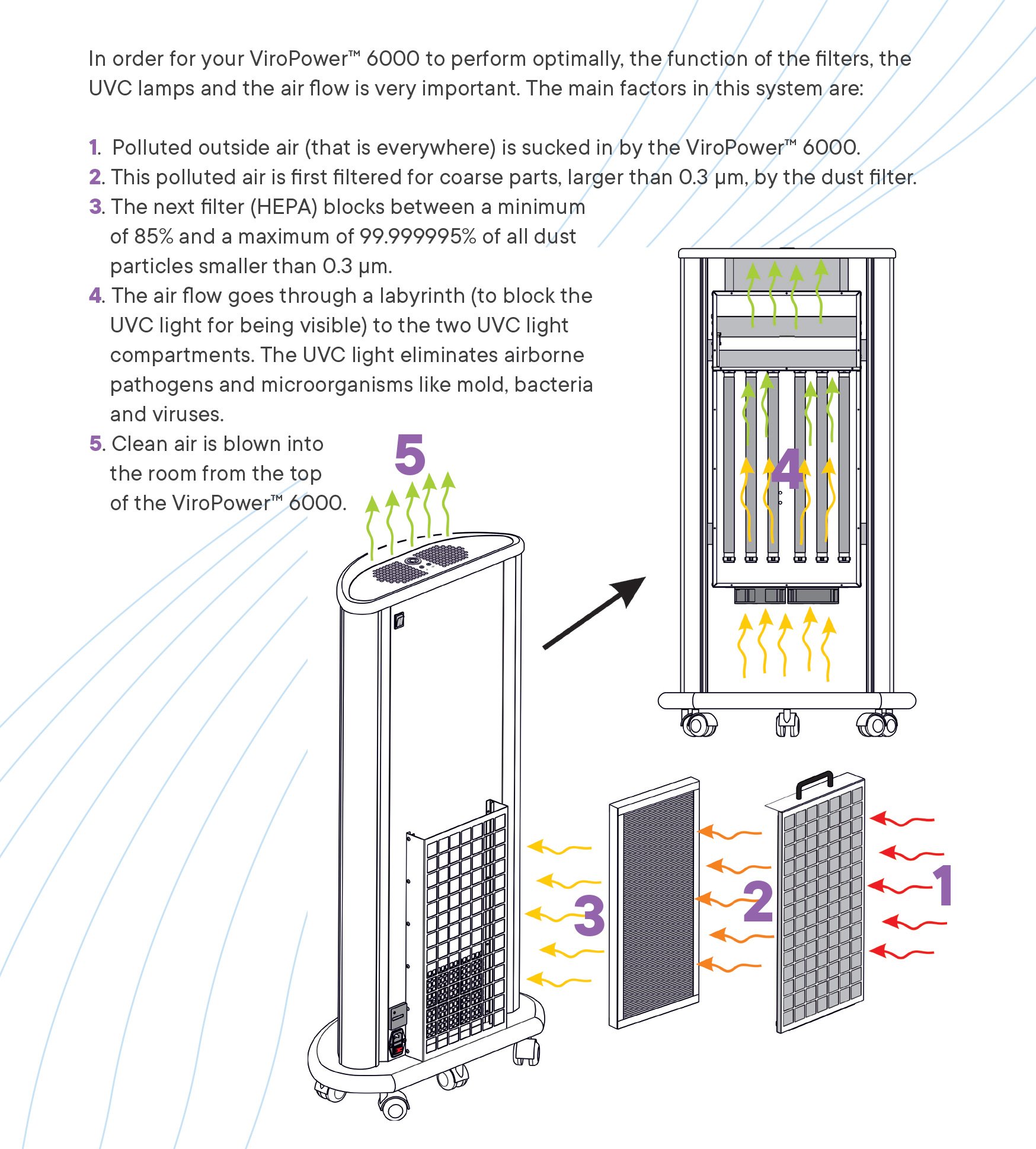 Then comes the exciting part, which sets the ViroPower™ apart from the rest, UVC light. The airflow goes through a compartment that houses UVC lamps, where the light coming from these tubes ELIMINATES airborne pathogens and microorganisms like, mould, bacteria, and viruses.